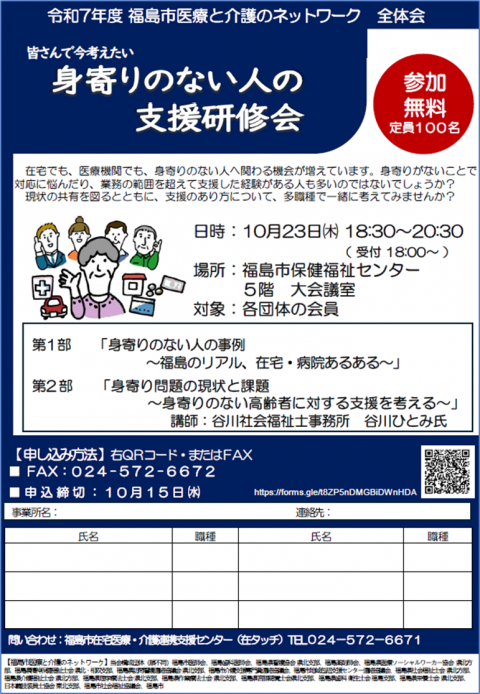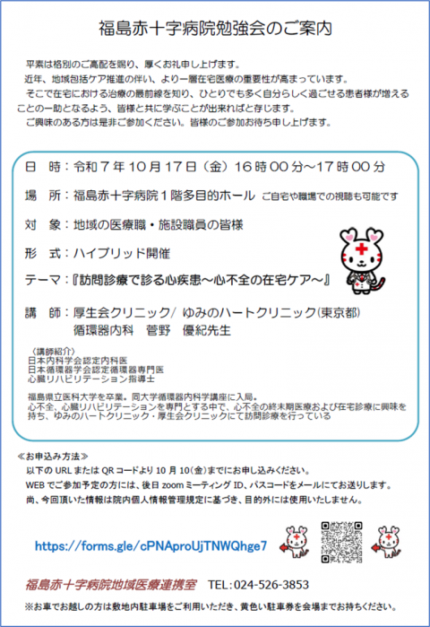 ①10月3日㈮ 医療と介護のネットワーク MCS研修会 「つかってみっせMCS」 ②10月17日㈮ 「訪問診療で診る心疾患~心不全の在宅ケア~」 ③10月23日㈭ 医療と介護のネットワーク 全体会 「皆さんで今考えたい 身寄りのない人の支援研修会」