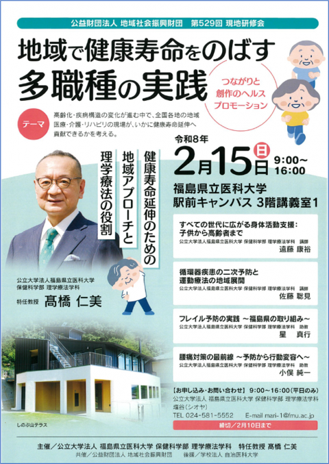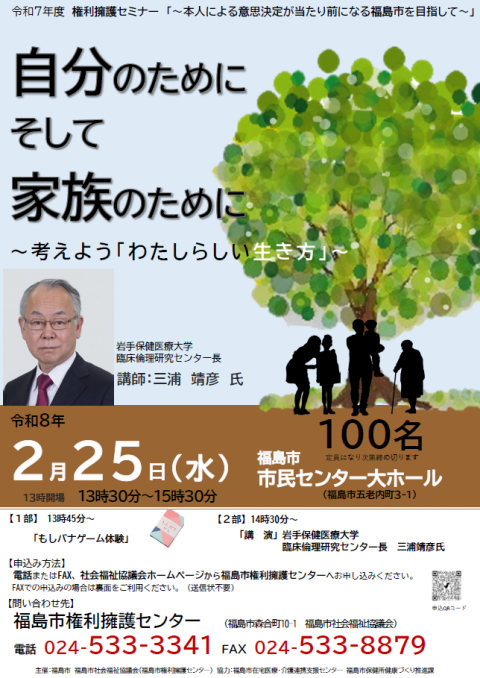 ①2月15日㈰開催 「地域で健康寿命をのばす多職種の実践」 ②2月17日㈫開催 令和7年度 認知症対応力ステップアップ研修会 「家族の声に、耳を澄ます。-若年性認知症(前頭側頭型)支援の本質をもう一度考える-」 ③2月25日㈬開催 令和7年度権利擁護センター「~本人による意思決定が当たり前になる福島市を目指して~」